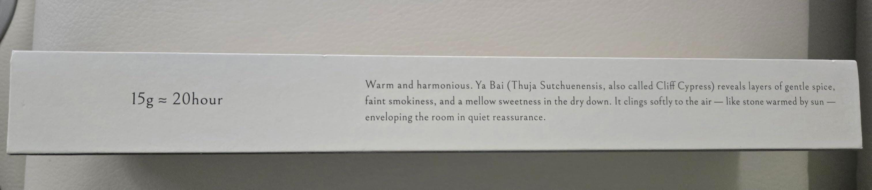 This vendor makes well-presented incense sets, with loads of information about their various scents. I think the price is primarily for presentation here, as I find the cypress, though cozy like a wooden chest, to be fairly standard and not really so different as to pay over 30 dollars for a mere 15 grams wrapped in paper. I enjoy it very much, however, in the afternoon for a meditation or with a book and some tea. It burns for about 45 minutes, as they are slightly longer than my other cypress sticks (the same scent and considerably cheaper). You might buy something like this as a gift, if you are an incense aficionado, because you can find essentially the same quality of scent in bulk for much less. The little rock is nice as a stand, but the ash goes everywhere, of course, so you'll need to set it on some tray anyway. But! I still offer this set a 4 for presentation and the long burn time with little to no smoke--I'm not sure I'd be back to buy the other scents at this price point, but maybe you don't mind the markup. I think it's nicely done!